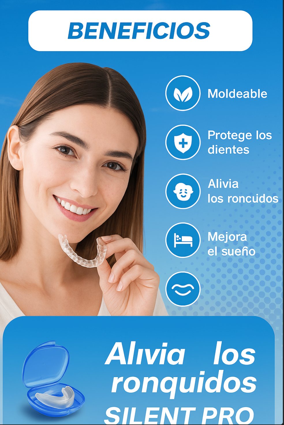 El Protector Bucal SILENT PRO fue creado para solucionar exactamente eso: ✔️ Reducir o eliminar los ronquidos. ✔️ Protege tus dientes del rechinido. ✔️ Permitir una respiración más libre y natural durante el sueño.