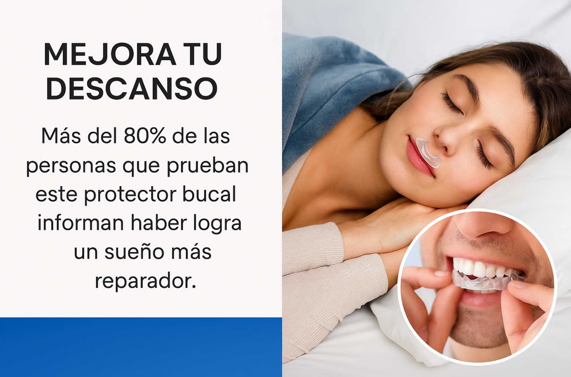 El Protector Bucal Antirronquidos / Antibruxismo está diseñado para mejorar tu respiración nocturna, proteger tus dientes y darte un descanso profundo sin interrupciones.